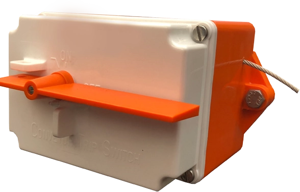The CTS 100 uses an electrical rotary switch, allowing personnel to trip it manually. The electrical switch is a self-wiping rotary switch (not a micro-switch), and consists of two normally open and two normally closed contacts. Once the switch has been tripped, the Orange colored flag is in the “Up” position to alert maintenance personnel. It must then be manually reset in order to restart the conveyor.