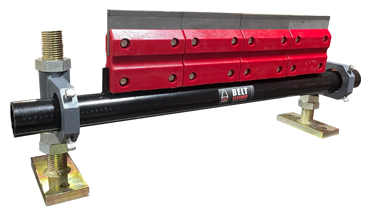 Arch SCP Secondary cleaners use high quality tungsten carbide blade segments to eliminate carryback. These blades are mounted to the support frame using a double channel “A” shape piece of urethane. The urethane mount allows the cleaner to flex against the belt maintaining tip pressure.